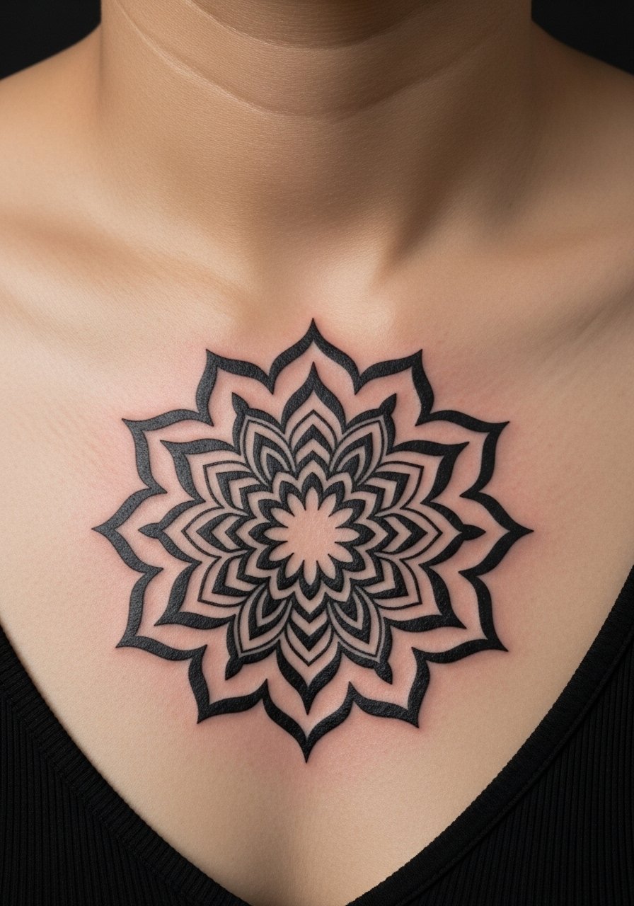 Sternum tattoos hurt more but look dramatic. Negative space mandalas age well because contrast remains. Healing takes longer—avoid chest-straining movement and follow aftercare closely. Common error: packing too many tiny dots; they can blur. Seek artists who do bold geometry and healed chest work.