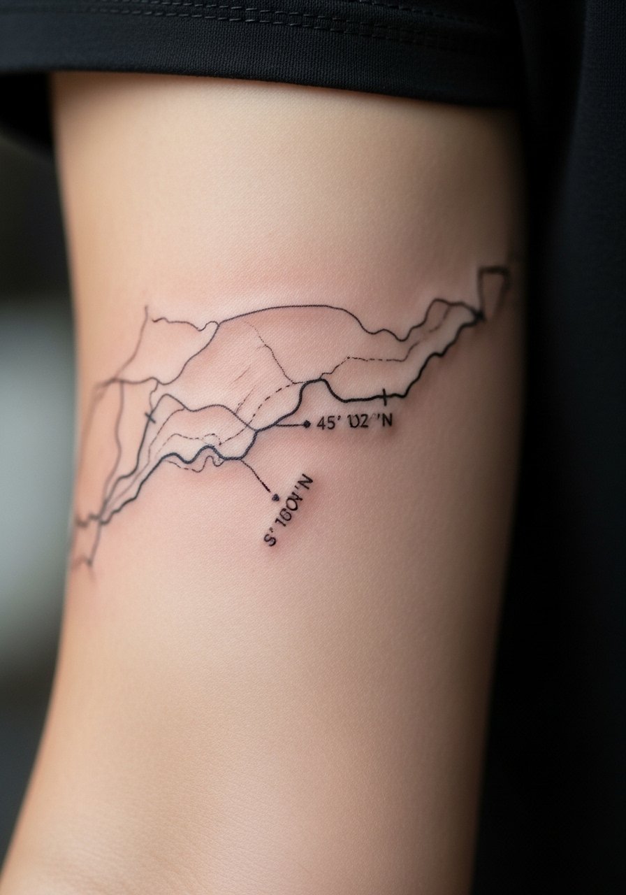 Inner bicep is tender but hides well. Fine map lines create narrative and age gently with moderate thickness. I recommend avoiding ultra-thin text—letters often blur. Ask the artist for healed examples of micro-line work on arms.