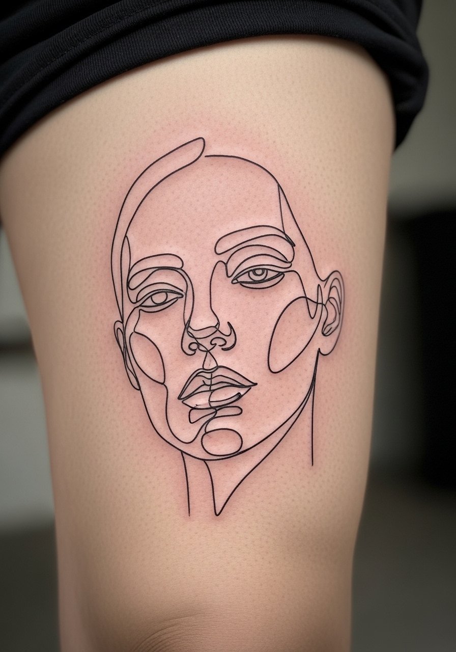 15. Surreal Line Portrait on Upper Thigh