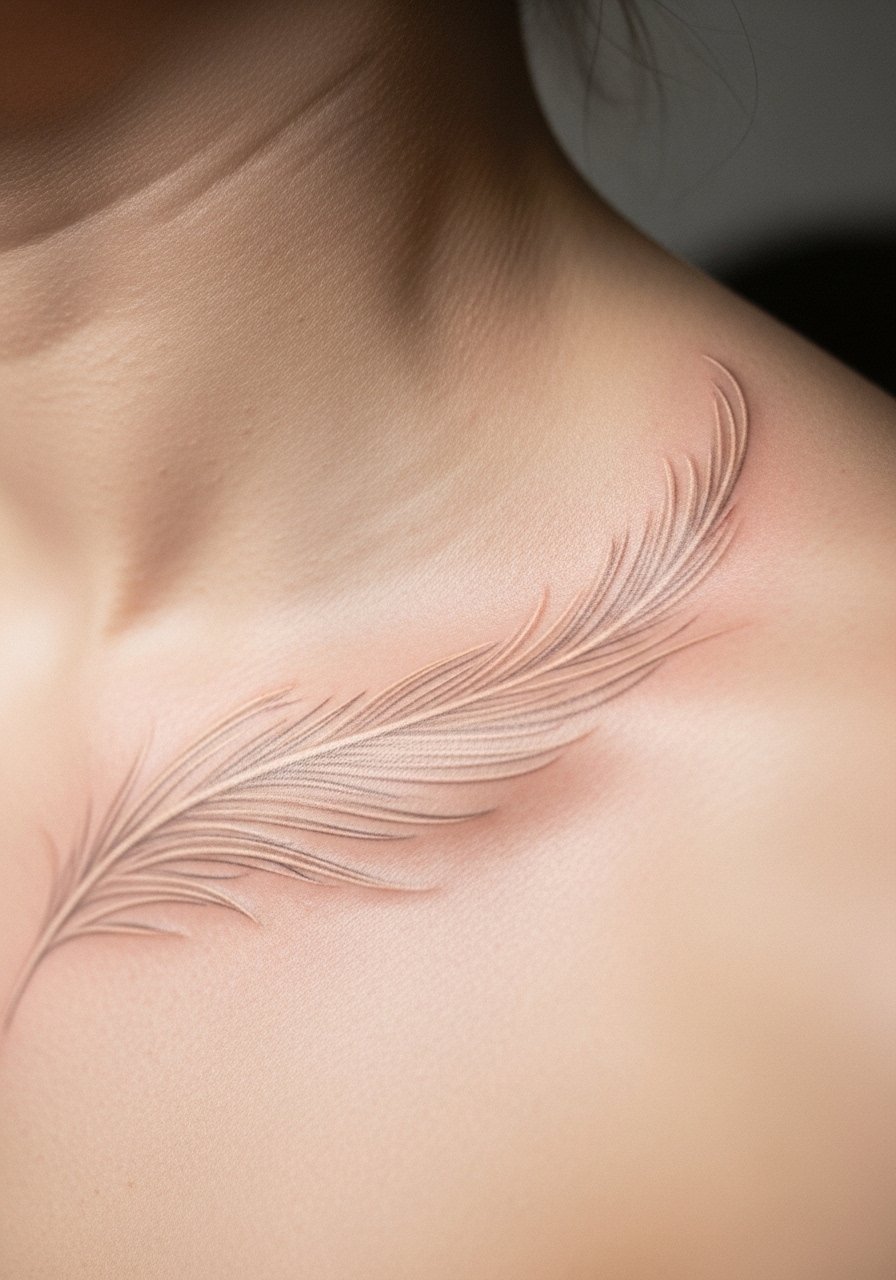Collarbone can hurt but looks elegant. Feathered lines soften into skin but maintain character if slightly bolder initially. Expect a few days of soreness and to avoid tight straps. Don’t pick ultrafine strokes that may vanish.
