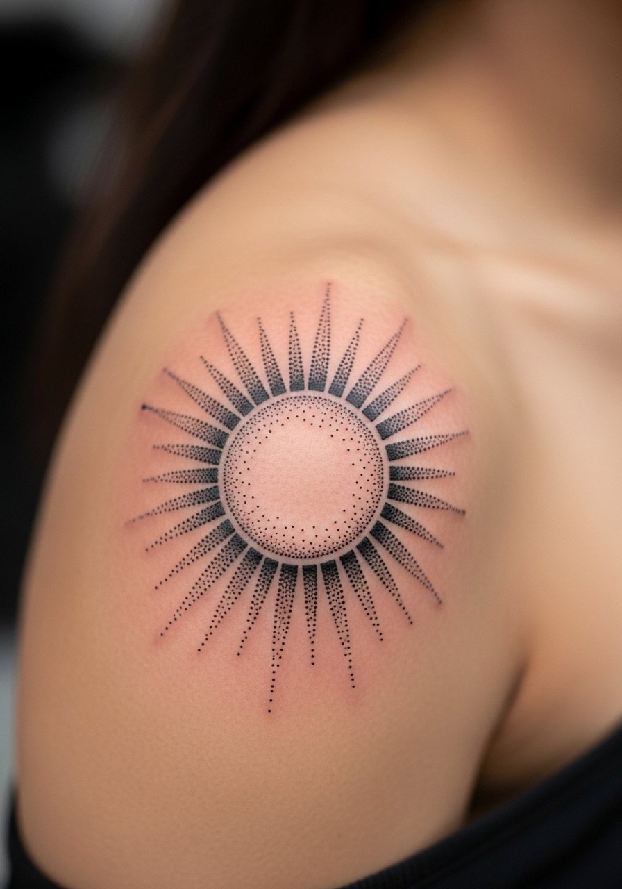 Shoulder caps handle dotwork well. Stippling creates texture that reads over years. Blending dots too tightly can create muddy areas; trust an artist who spaces dots intentionally. Sun motifs pair well with minimal color accents.