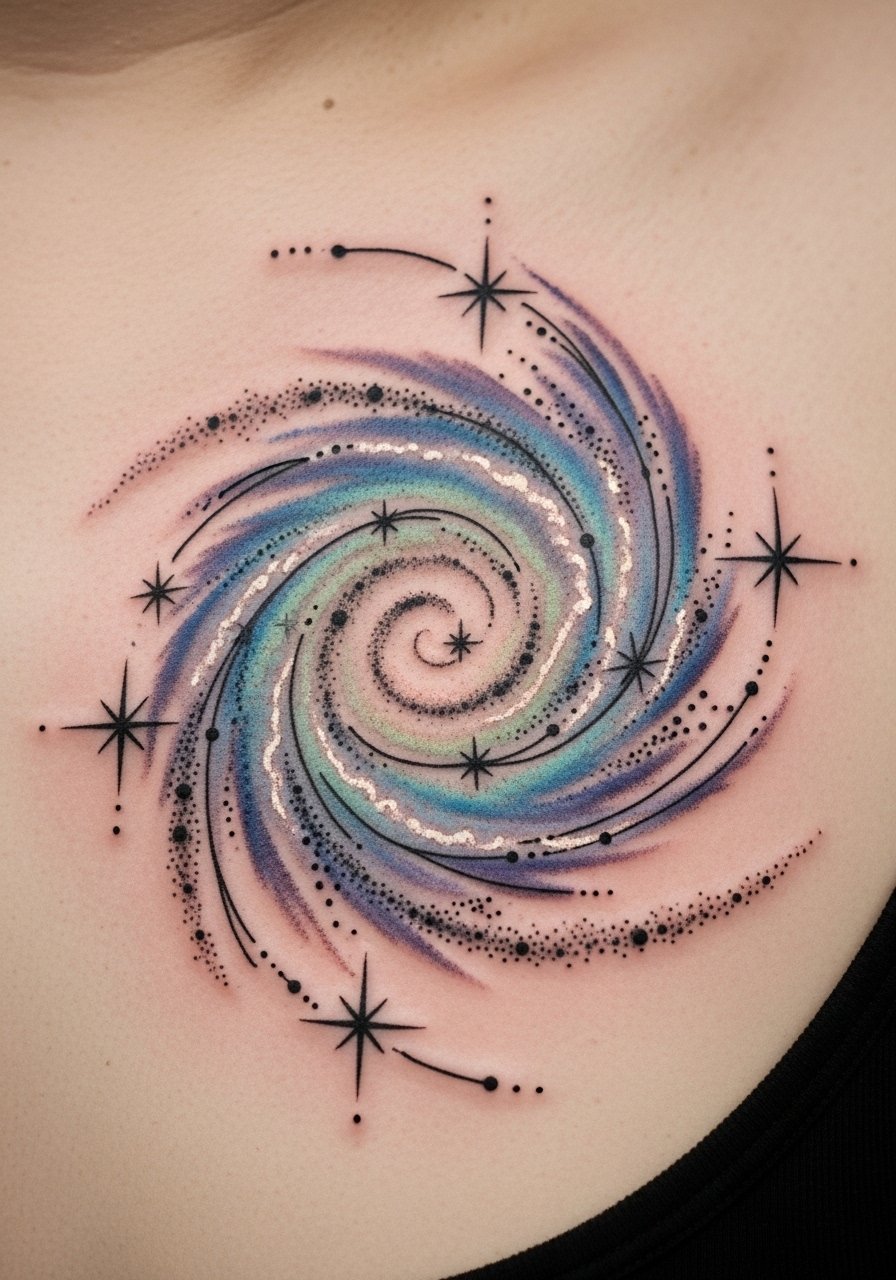 Sternum edge is sensitive. Galaxy effects can be layered to look rich healed. Colors need saturation planning—ask artist about healed pigment examples. Avoid tiny star specks that disappear.