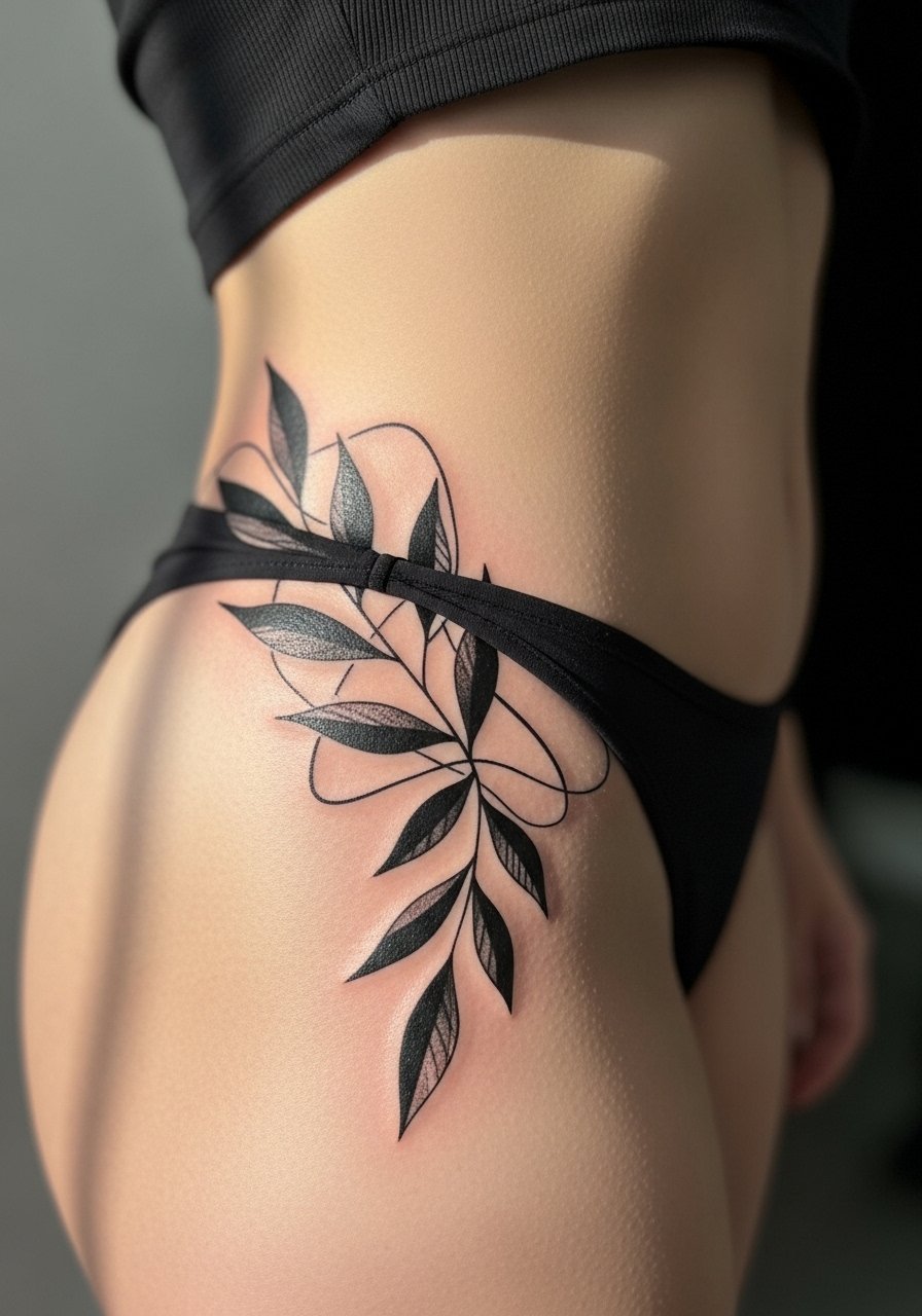 Side hip allows for curving compositions that flatter the body. Monochrome botanical shapes stay readable as skin shifts. Expect some tenderness during healing. Artists who design for body contours produce better healed flow.