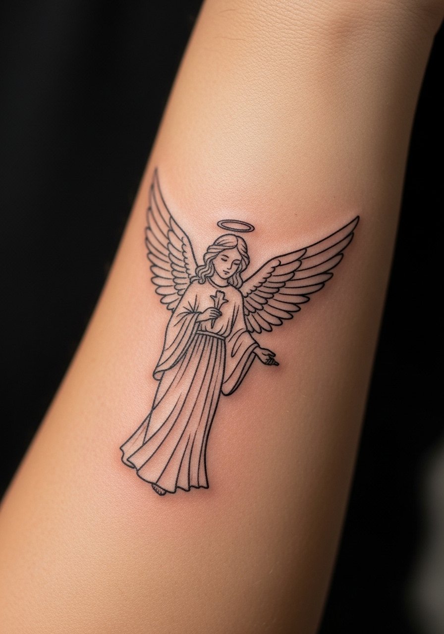 I first saw this on a friend who wanted subtle protection. Expect low to moderate pain on the inner forearm. Sessions run short, usually 1 to 2 hours. Ask your artist for slightly heavier key lines around the silhouette so the angel reads from afar after a year. A common mistake is too-thin lines across the whole piece. That version fades into a gray smudge after two years. Tell your artist you want intentional variance in line weight, with slightly bolder contours and soft hatch shading inside. Healed, the wings keep a soft, airy look at six months, but they will lose some crispness by year three. If you want longevity, avoid tiny feathers packed tightly.