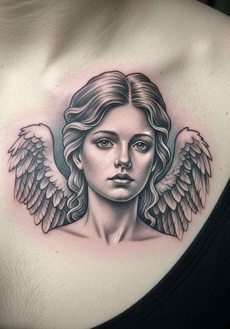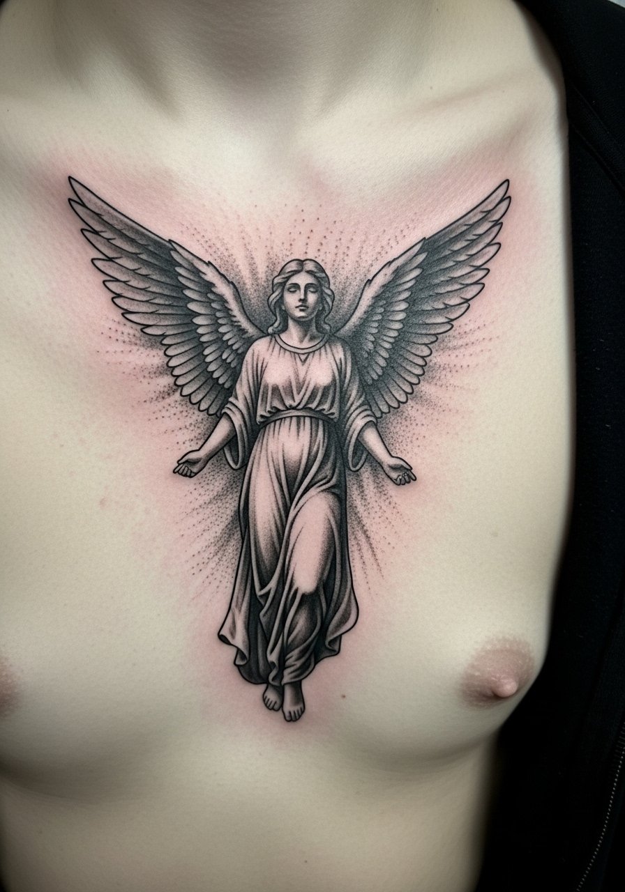 The sternum can be intense pain but it gives dramatic placement for a chest armor theme. Chiaroscuro uses strong light and dark contrast to make the angel feel sculpted. Sessions are usually long, 3 to 6 hours. Request a clear focal light source in the reference so your artist can plan shadow placement. A mistake I notice is adding too much gray wash across the sternum. That turns into uniform gray and loses depth. When healed at one year the highlights still pop if the darks were layered properly. Ask your artist about staged sessions so shading can heal between passes.