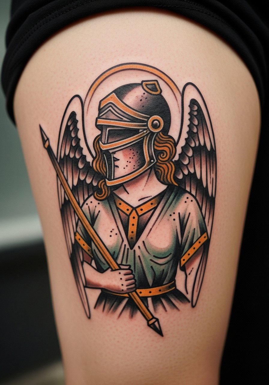 I chose this placement after seeing how thigh flesh holds color. The thigh is forgiving and less painful than ribs. A neo-traditional helmeted angel reads like armor because of thick outlines and stylized shading. Plan for a 2 to 3 hour session. During consultation say you want clean outlines and saturated fills in large shapes. The mistake I see is clients asking for tiny texture work across the helmet. Those tiny details wash out on the thigh where sweat and clothing cause extra friction. Healed at one year, the helmet should still be crisp if the lines were left bold. If you want a version that ages gracefully pick fewer color gradients and more solid areas.