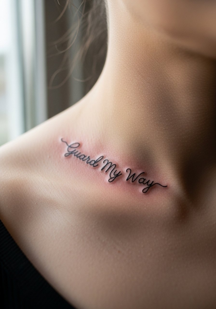 I recommend single-needle script on the collarbone only if you want intimate wording that reads like a talisman. Collarbone pain varies and often feels sharp when needle hits bone. Sessions are short. If you want text, specify the exact phrase and font during consultation. I have seen tiny script fade into illegibility when placed too close to the bone and too thin. The text "Guard My Way" looks like a band of armor to the wearer. Ask for slightly thicker downstrokes and consistent spacing so the word remains legible after two years. Healed, thin script softens quickly on the collarbone compared to forearm placements.