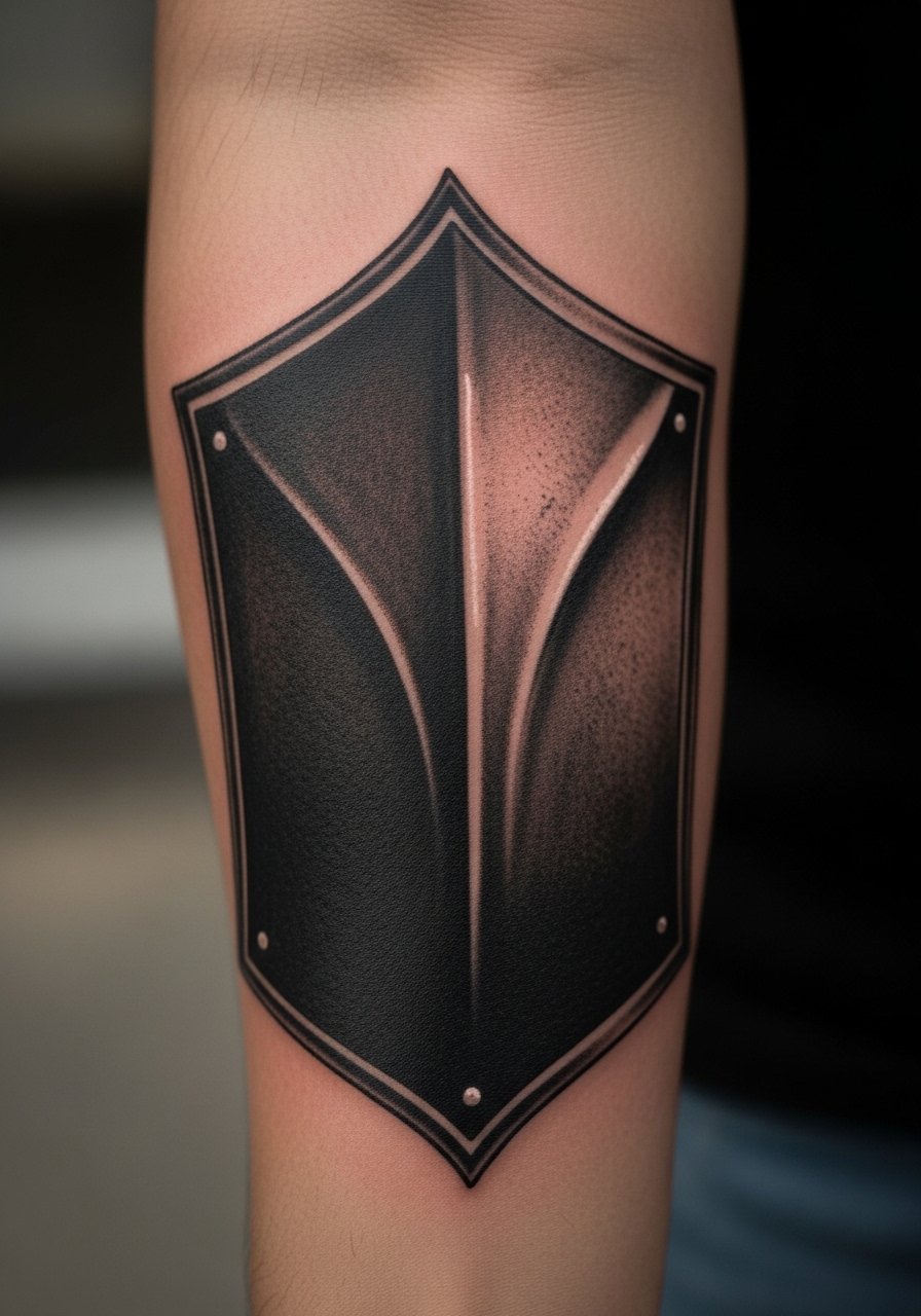 Bold black outlines and saturated color read like armor in a traditional treatment. I recommend this for people who want a visible statement and can handle moderate pain on the upper arm. Sessions take 2 to 4 hours depending on color. Tell your artist to keep color blocks large and avoid tiny color dots. Small color work tends to blur into muddy patches as it ages. A version I saw that used very small gradients lost vibrancy after sun exposure. The right approach keeps the shield readable even at two years healed. If you want to place this on the bicep or tricep the curvature changes how the shield sits. Try the design on the actual arm with stencil movement before committing.
