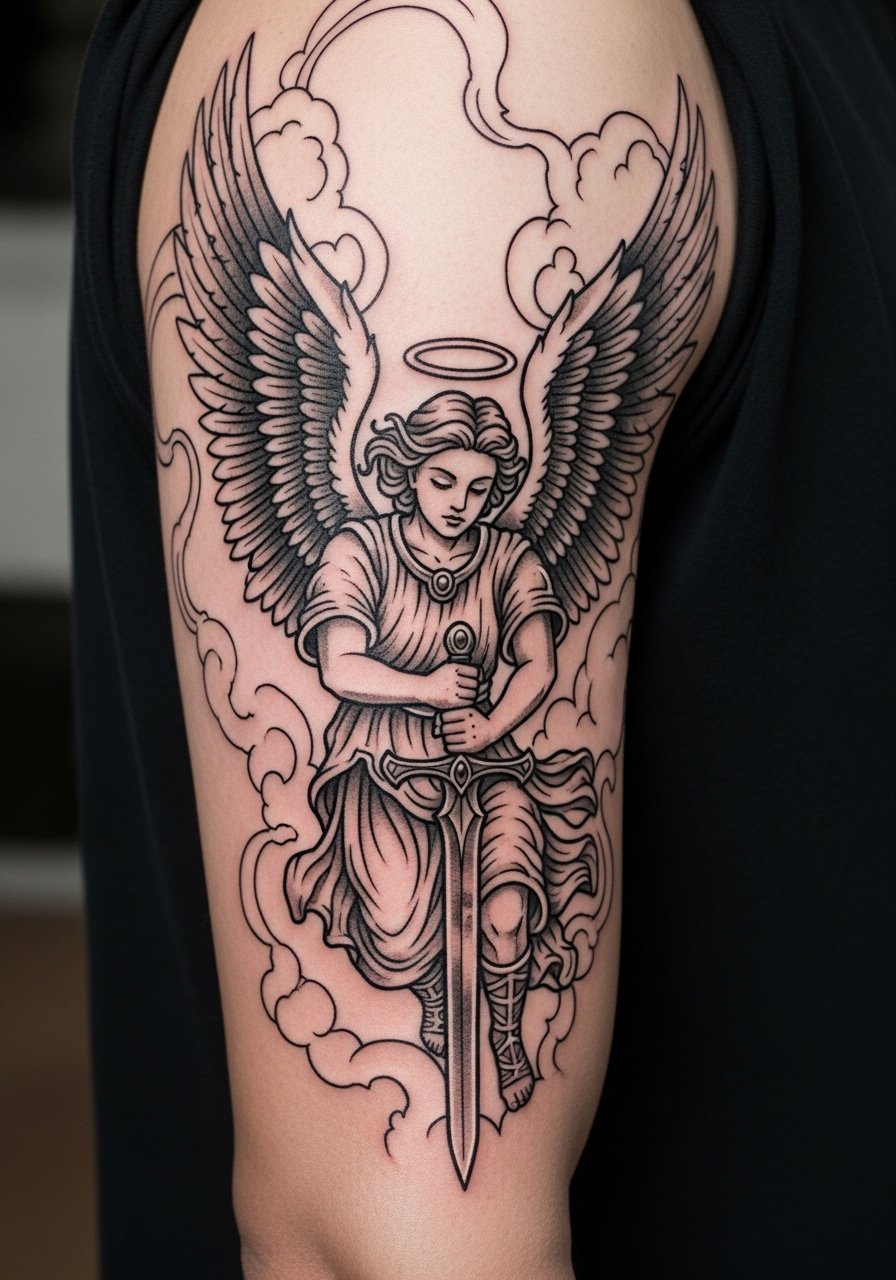 15. Illustrative Angel with Sword on Outer Bicep