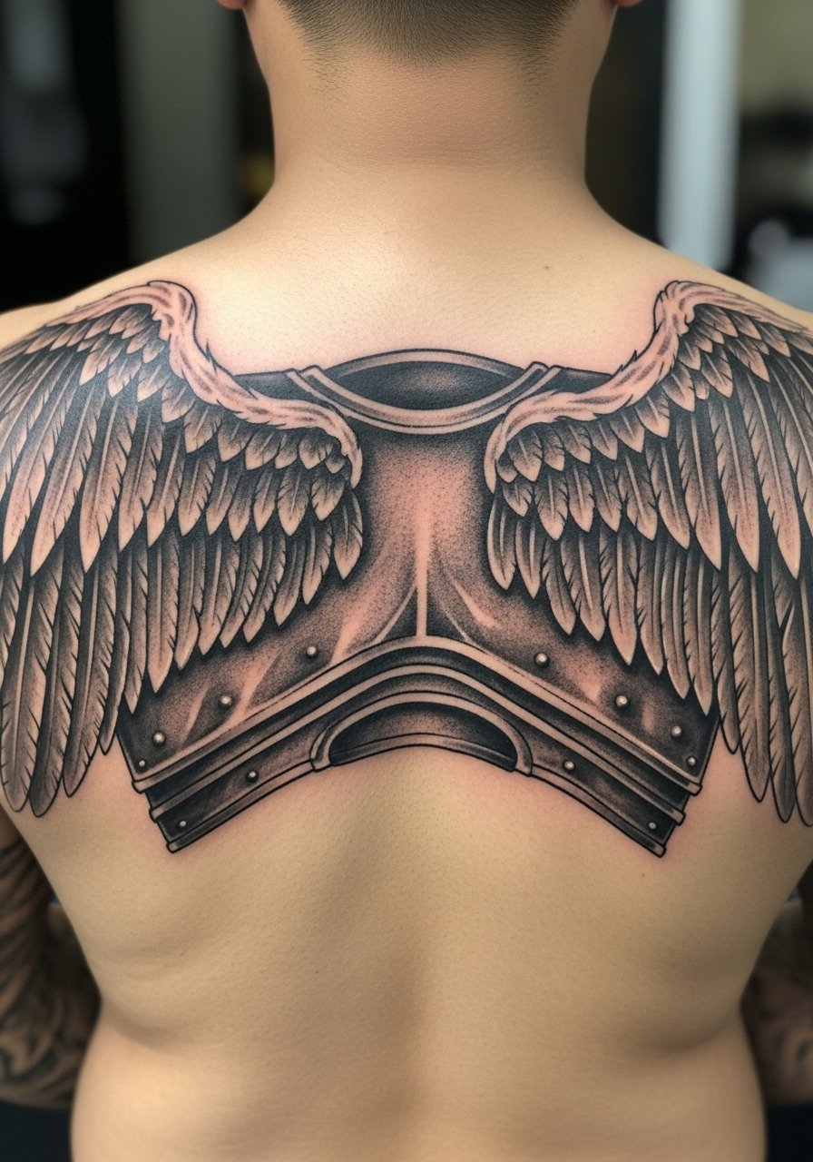 I saved the biggest for last. A full back plate is committed work and will be multiple long sessions. Pain varies across the back but expect higher sensitivity near the spine. The armor feel comes from large wings and a defined chest plate. During consultation request staged shading sessions and discuss how the wings will taper into the shoulders. A mistake I see is trying to cram filament-level feathers across the whole back. Those thin elements rarely survive long term. Healed after a year the wings should still read like a protective spread if the artist used bold structural lines. Plan for long-term maintenance and sun protection.