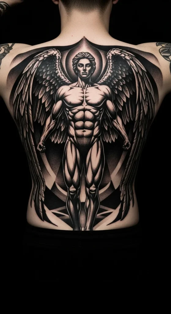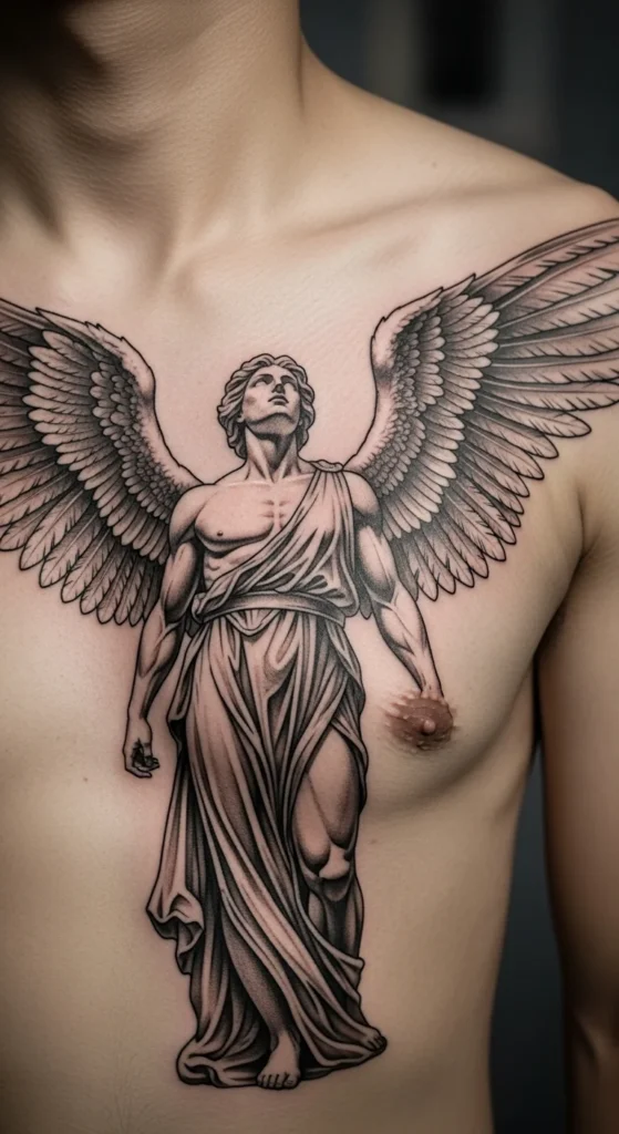 Chest tattoos feel personal. A guardian angel placed here can symbolize strength and protection. To keep things budget-friendly, start with a small design over one pectoral and expand later. Simple shading along the muscles helps the figure blend well. If you’re unsure about size, use large tracing paper to test the span. This style suits people who want their tattoo to sit close to the heart.