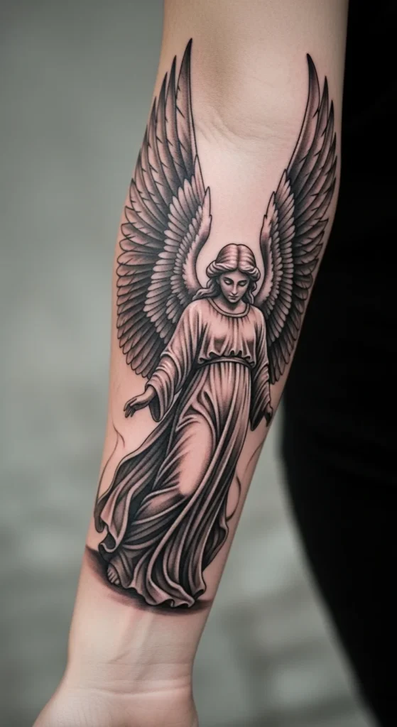 A vertical forearm angel gives you space for movement without overwhelming the area. Flowing robes help the design feel natural. If you want a simple version, skip background clouds and halos. Black and gray shading keeps the cost manageable. The forearm also heals quickly, which is helpful. Test the flow by sketching a long robe shape and placing it along your arm. This style works for people who want something meaningful but slim.