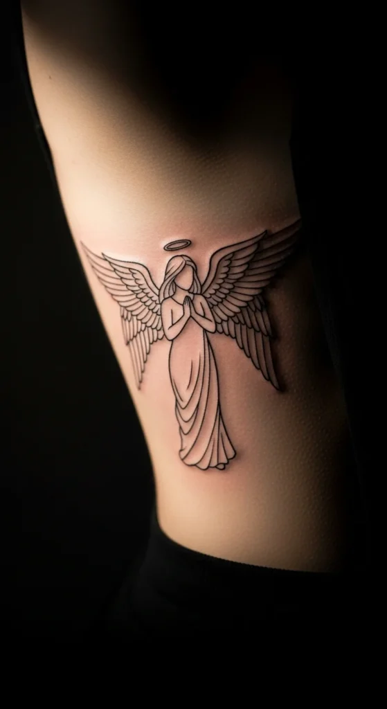 Rib tattoos can be tender during the session, but they look graceful. Outline angels work well here because they flow with the body. To reduce cost, stay with single-line wings. Test designs by taping a printout along your ribs. Aim for a slim shape so it fits comfortably. This style works for people who want something heartfelt but discreet.