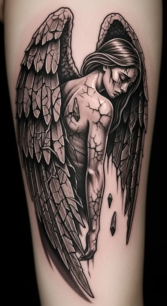 A fallen angel tattoo can express struggle, resilience, or a moment of personal change. Many choose broken wings to show past pain without making the design dark. It works nicely on the upper arm because the curve helps the wings flow. To keep costs down, ask the artist for blackwork shading instead of color. If you want something meaningful but simple, choose a single wing folded downward. It stays symbolic while keeping the tattoo smaller. Use thin lines to maintain a soft aesthetic. People often connect this style to difficult chapters they’ve overcome, making it a meaningful conversation piece.