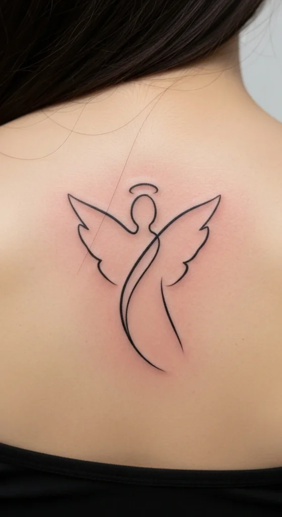 Abstract angel silhouettes keep things clean and modern. You can express meaning without detailed features. Forearms and upper backs fit this style well. For a budget-friendly option, stick to a single-line outline. Test shapes by drawing on tracing paper. People like this approach when they want a symbolic tattoo that stays subtle and timeless.