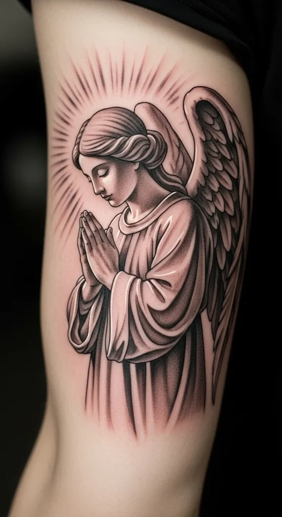 A praying angel tattoo brings peaceful energy. The hands usually sit at the center, so keeping them clear helps the meaning stand out. Many place this on the wrist or inner arm for a quiet moment of faith. If you prefer a minimal approach, choose a silhouette without heavy shading. You can also skip background clouds to keep the price low. For a DIY test, sketch the pose on tracing paper and tape it on your arm to see how it fits. This style works well when you want a subtle reminder of hope and trust through daily challenges.