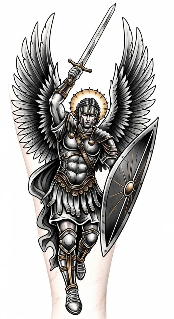 Archangel Michael tattoos feel strong and symbolic. Many people choose this design to represent courage during difficult moments. The sword adds a bold touch, but you can keep the tattoo affordable by staying in blackwork. Upper sleeves are ideal because they allow space for the wings to spread without crowding. If you want something smaller, try a compact version with only the sword and halo. Test proportions at home with a printout. Keep the robes flowing in simple lines to avoid long sessions. This style suits anyone who connects with strength, justice, or personal battles they’ve overcome.
