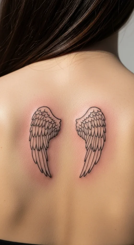 Minimal wing tattoos are popular because they fit many styles. Shoulder blades give a natural shape that makes wings look balanced. Thin-line designs keep costs low and heal quickly. If you want a symmetrical look, measure with a flexible ruler before finalizing the stencil. For extra meaning, curve the wings upward to symbolize hope. You can also try adding tiny stars for a personal touch. This design is easy to maintain and stays crisp over time when kept simple.