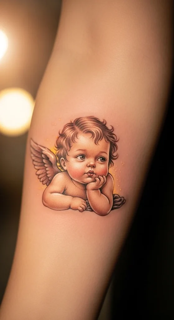 Cherubs feel gentle and comforting. Many people choose them to remember loved ones or celebrate new life. A small forearm placement works well and stays affordable. Keep the shading soft around the cheeks to make the face feel warm. If you want a sentimental touch, add a small date beneath it. You can test this using washable markers before committing. Cherub designs also look nice on the upper arm for a classic style that ages well.