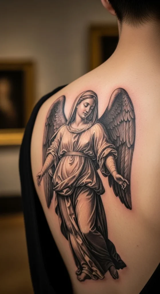 Renaissance-style angel tattoos feel artistic and timeless. These designs often include flowing robes and soft shadows. If you want a budget-friendly version, keep the piece small and stay with grayscale shading. Upper arms and calves work well because they handle detail without stretching. For a DIY test, place printed artwork on your skin to see how it flows with curves. This style is perfect for people who appreciate traditional art while keeping the meaning personal.