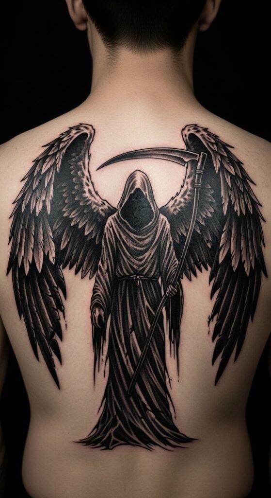Some people choose this tattoo to express change or endings. It doesn’t have to look frightening—many opt for lighter shading and softer wings. Blackwork keeps it budget-friendly. Forearms work well because the shape fits vertical designs. A simple cloak outline can replace heavy details. Try tracing different cloaked shapes at home to see what feels right. This style suits people who connect with rebirth or powerful transitions.