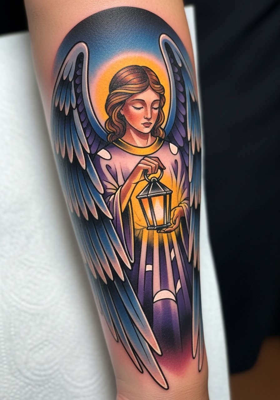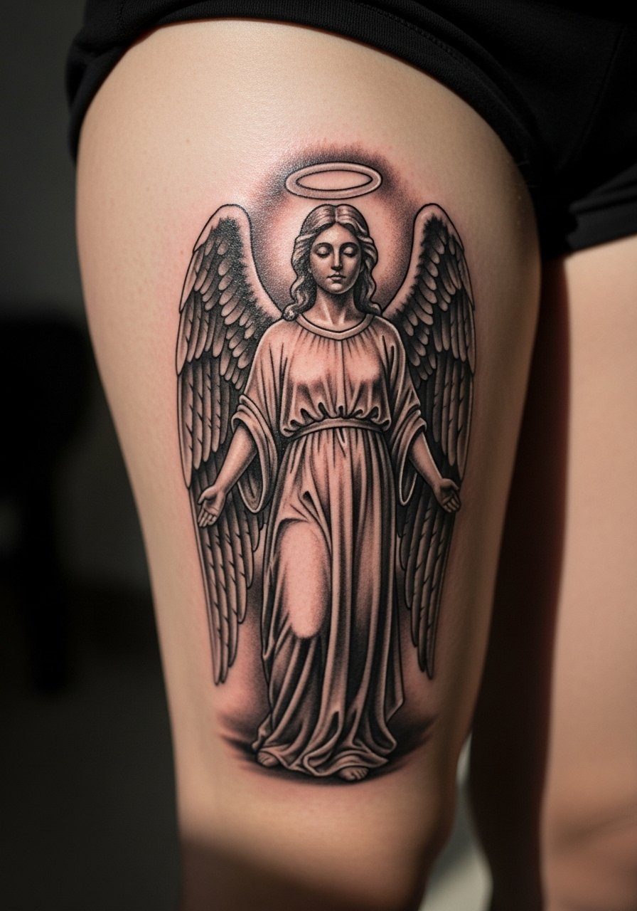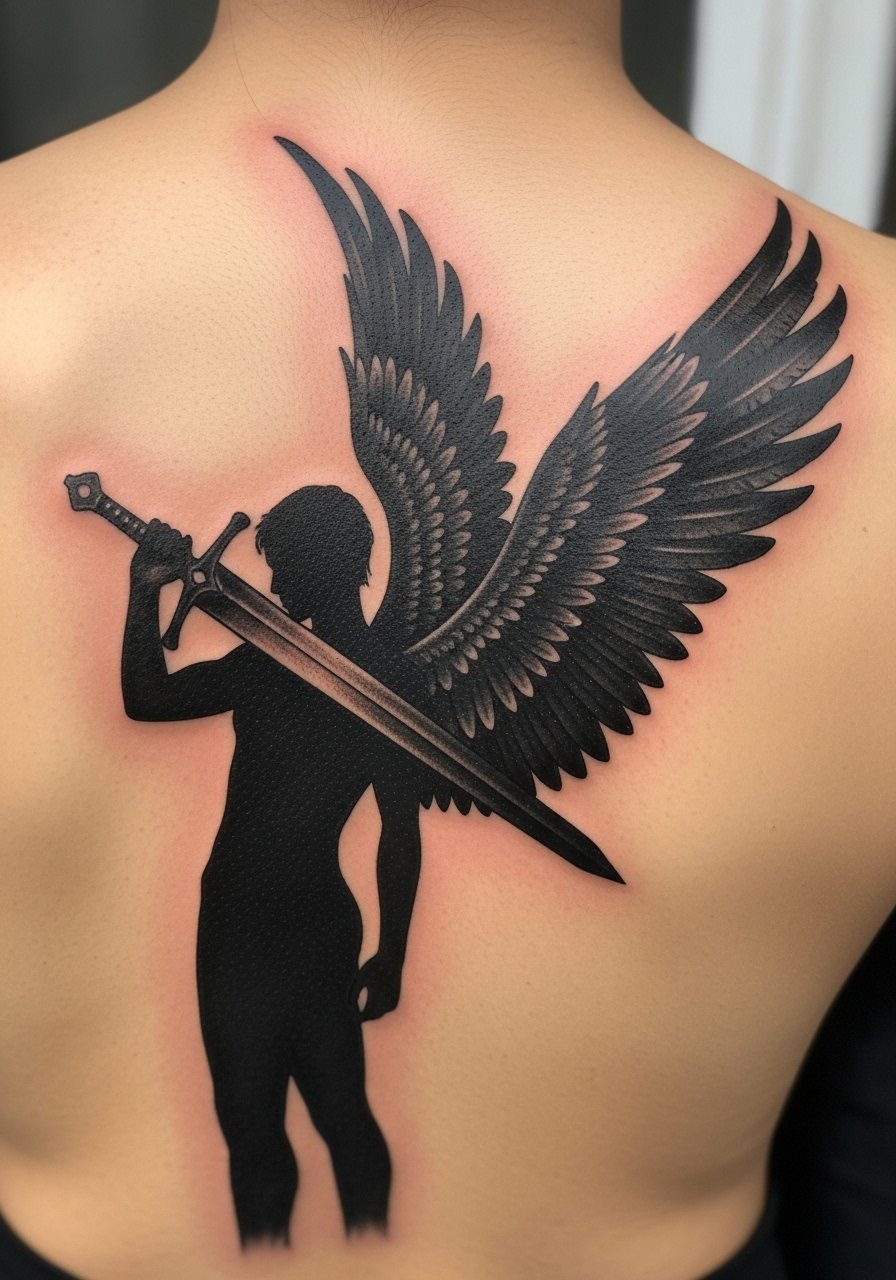 There is a clear visual impact with large-scale blackwork on the back. This is for people who want an edgier interpretation rather than traditional religious portraiture. Three-session projects are common for 8 to 12 inch pieces. During your consultation ask about saturation passes and how the artist plans to keep the negative space crisp between feathers and armor. Some clients regret tiny cross-hatching in large black fields since it can patch unevenly when healed. Expect a heavy initial scab phase but long-term stability once saturated. If you gain or lose a lot of weight the overall composition can warp, so discuss placement relative to shoulder blades.