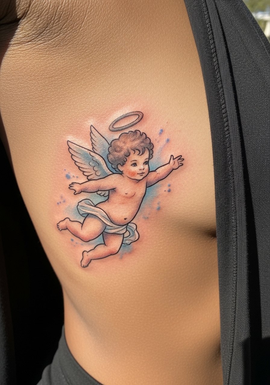 2. Watercolor cherub in flight on the ribcage