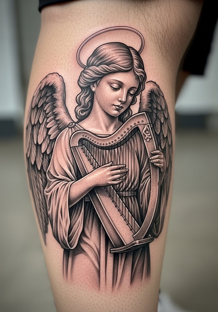 Calf placements are forgiving for micro-realism because the skin is stable and sees less sun. Expect two sessions for a six inch micro-realism figure and moderate pain near the shin. When consulting bring close-up references of the harp and any facial expression you want preserved. A major mistake is asking for ultra-fine hairline strokes too close together. Micro-realism holds if the artist uses contrast and selective saturation instead of endless tiny lines. Touch-ups are less frequent here but plan for one at year three if you wear shorts a lot.