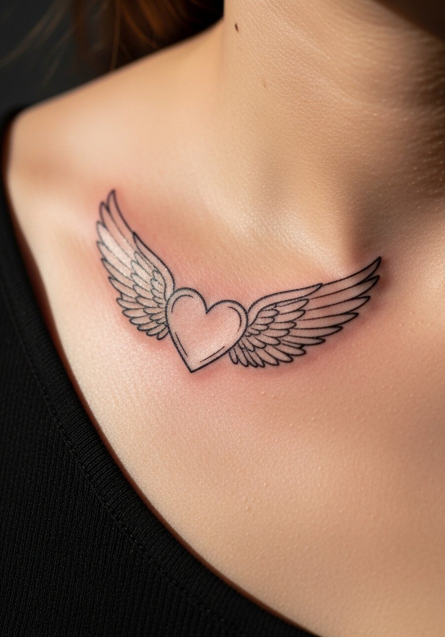 11. Fine line winged heart along the collarbone