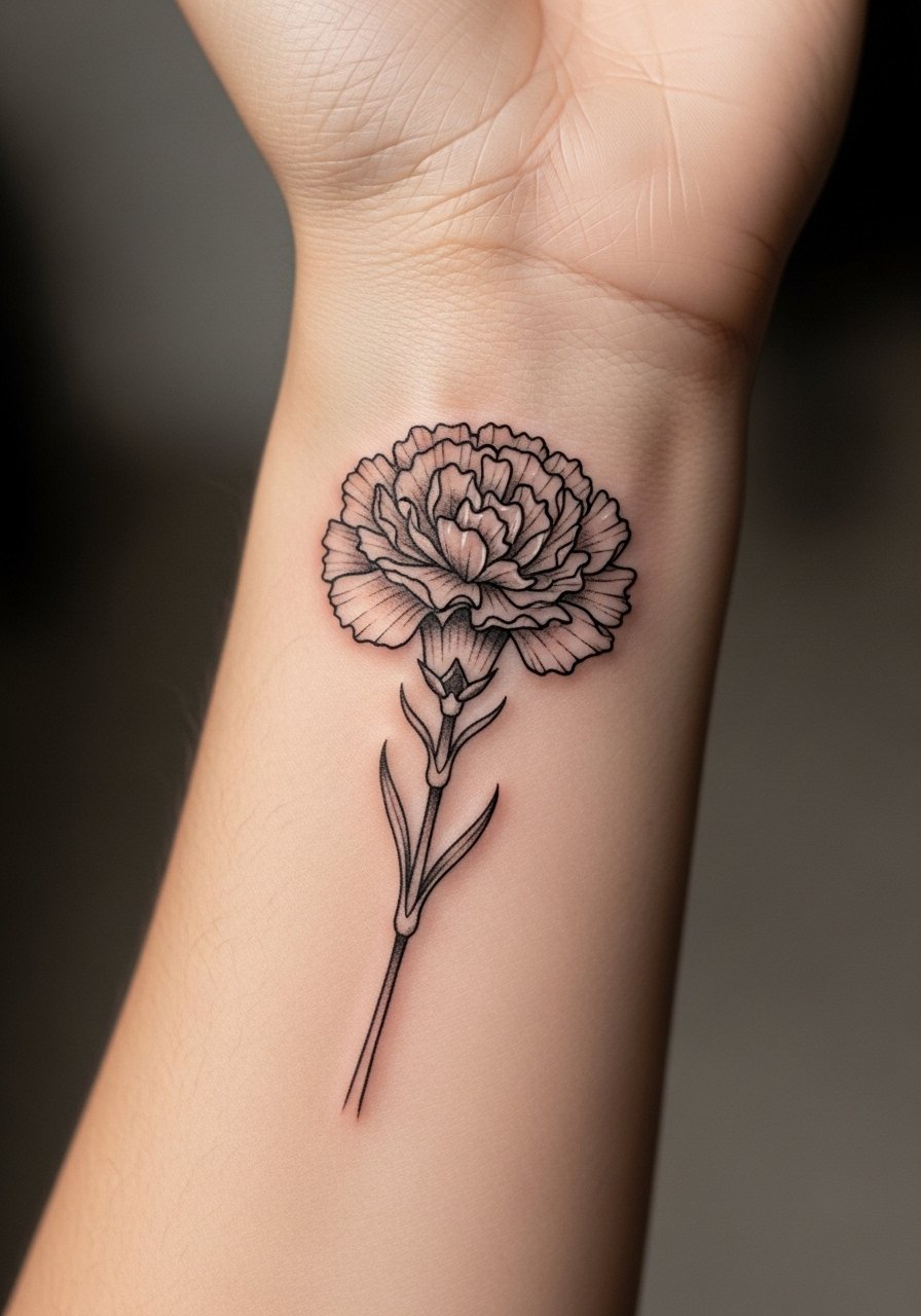 I got my first carnation as a fine line wrist piece and loved how unobtrusive it was. Fine line makes carnations feel intimate and personal. The inner wrist is visible and easy to cover. Expect a light sting that settles quickly; movement can make healing slower. Lines can blur if done too thin—ask for slightly stronger line weight if you want longevity. Heals in 2-3 weeks on the surface; full settling takes a few months. Artists familiar with botanical work will know how to space petals so the design keeps its shape as it ages.