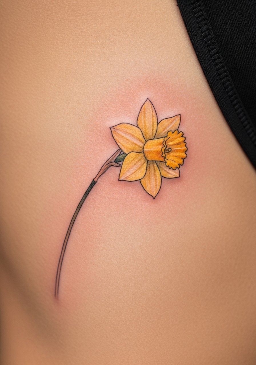 Ribcage pieces look personal and dramatic. Daffodils in a fine line frame with watercolor fills create a soft, nostalgic vibe. Expect higher pain because the rib area is bony and moves with breathing. Healing takes longer—avoid heavy chest movement and tight clothing in the first two weeks. Watercolor can fade faster; ask your artist about slightly deeper saturation at the time of tattooing. A common mistake is overcrowding petals—lean into negative space for longevity and clarity.