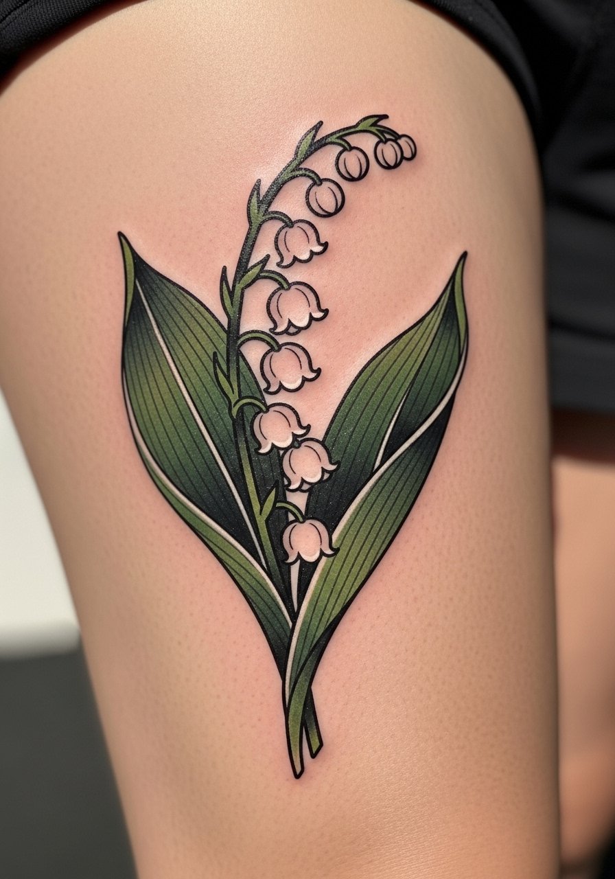 Thighs are forgiving and great for larger neo-traditional pieces. Lily of the valley carries delicate symbolism; neo-traditional enhances that with saturated color and crisp shading. Pain is low thanks to fleshier tissue. Healing is straightforward but keep friction down from jeans. These designs hold color well; however, white highlights can fade—ask your artist about contrast to keep bells readable over time. Avoid overly busy backgrounds; let the bells breathe.