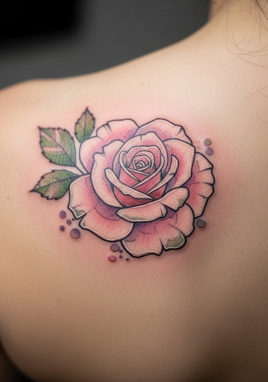 Shoulder caps are classic for roses. Watercolor gives a loose, painterly feel that looks great fresh and softens healed. Pain is mild. The risk is watercolor fade—artists often recommend layering or subtle outlines to hold shape. Heals in 2-3 weeks on the surface. I’ve seen watercolor roses look ethereal healed, but if you want bold longevity, ask for a mix of saturated color and soft wash. Avoid tiny details that rely solely on wash.
