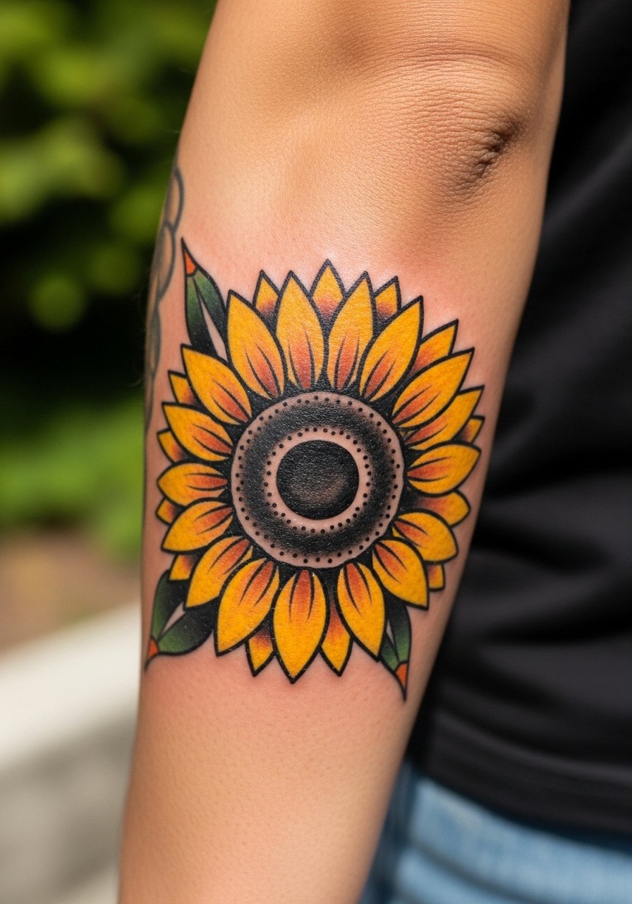 Sunflowers in a traditional style are resilient—thicker lines and solid color hold up. Outer forearm is low-pain and easy to show off. Heals reliably; just avoid heavy sun while fresh. Expect some natural softening of edges over time, but traditional pieces age gracefully. Common mistake: tiny petal details that blur—go for solid shapes. Artists who specialize in American traditional will nail contrast and longevity.