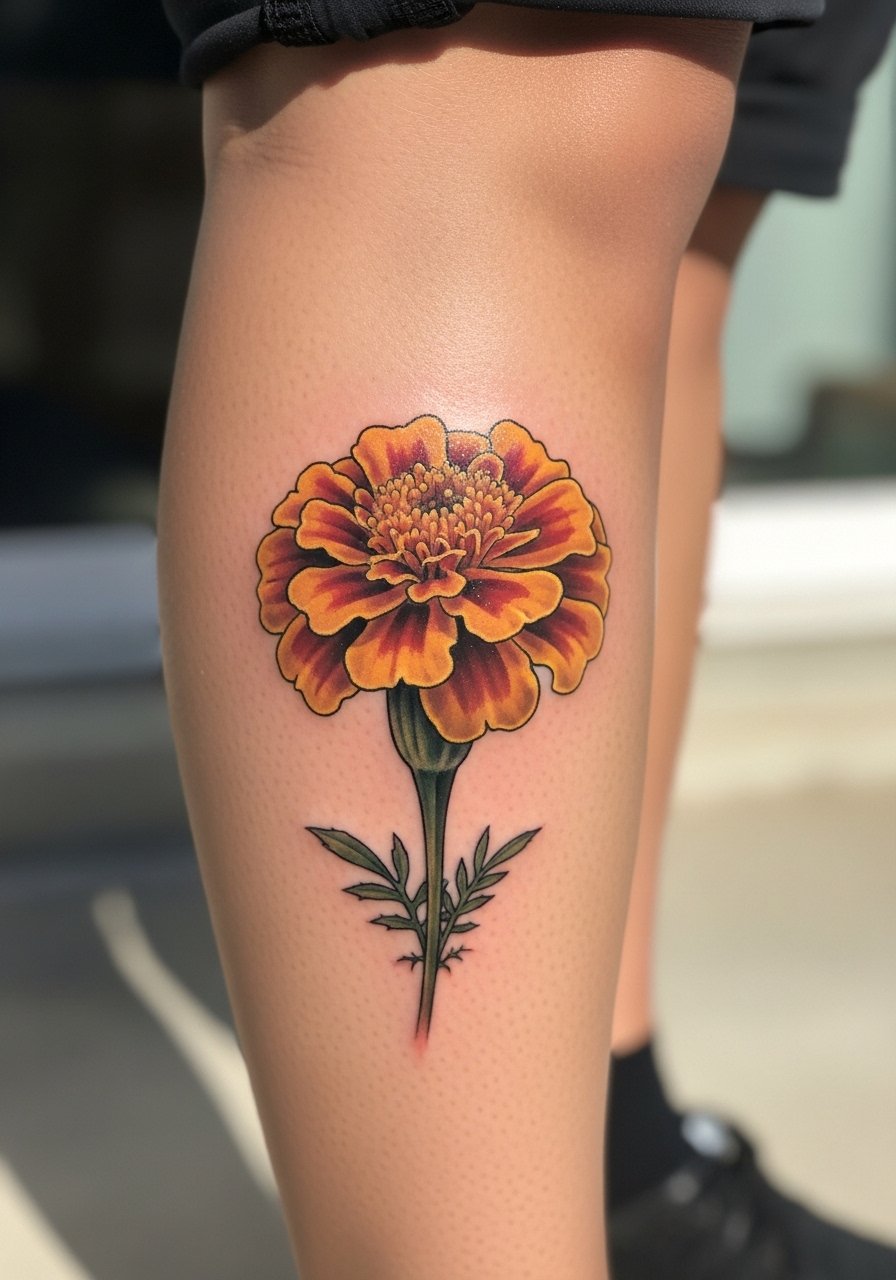 Micro-realism brings marigolds’ layered petals to life. Lower leg placement is forgiving and visible. The area tolerates color well, and micro shading reads beautifully when healed. Beware overly tiny details in thin-skinned areas—legs usually keep detail better. Healing is straightforward; showers and light activity are fine. Ask your artist for healed photos of micro-realism florals to set expectations.