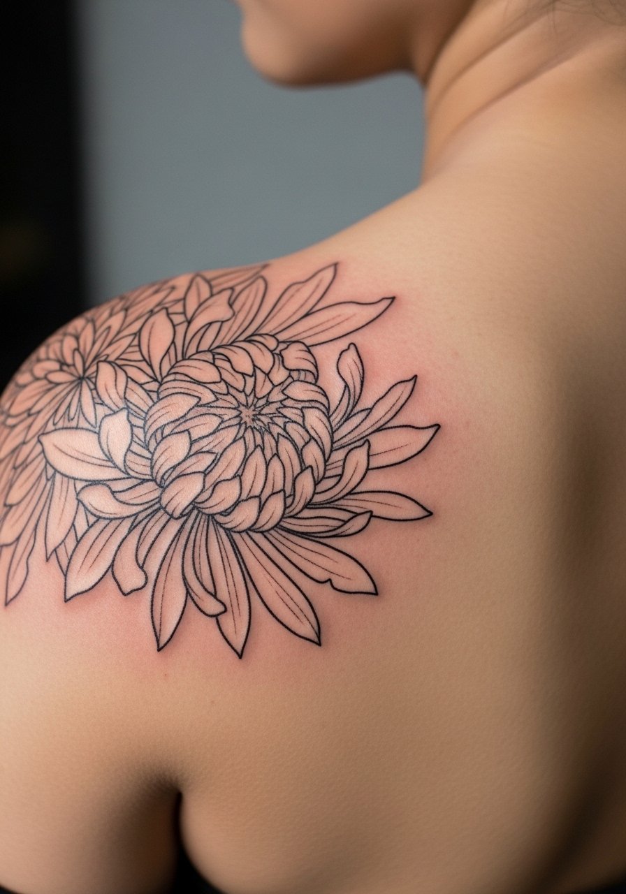 11. Linework Chrysanthemum on Back Shoulder