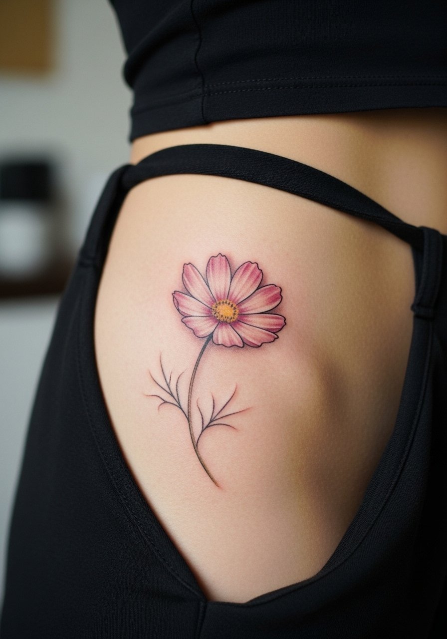 Hip tattoos can be sensitive due to contour and movement. Cosmos in neo-traditional style reads romantic and soft. Expect higher discomfort if the area hugs bone or the pubic bone is near the design. Healing requires loose clothing and attention to sweat. Colors hold up well here; ask for slightly richer saturation if you want long-term vibrancy.