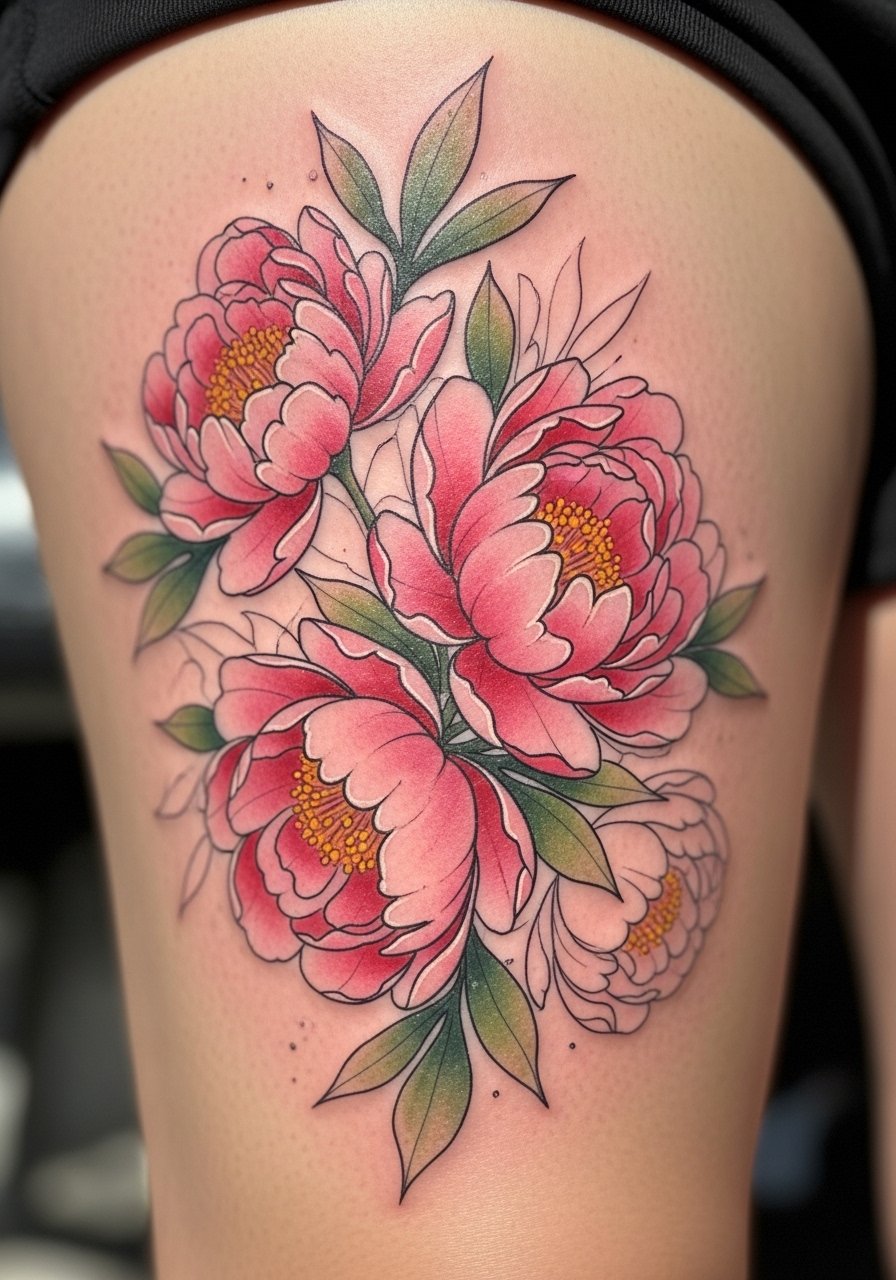 Peonies with watercolor washes become soft, romantic thight sleeves. Thigh flesh makes sessions comfortable; multiple sittings are common. Watercolor fades more than packed color, so artists often mix thin outlines for structure. I’ve seen healed watercolor peonies remain lovely if touched up after a year. Common mistake is overextending wash into areas that rub—plan the layout with clothing in mind.