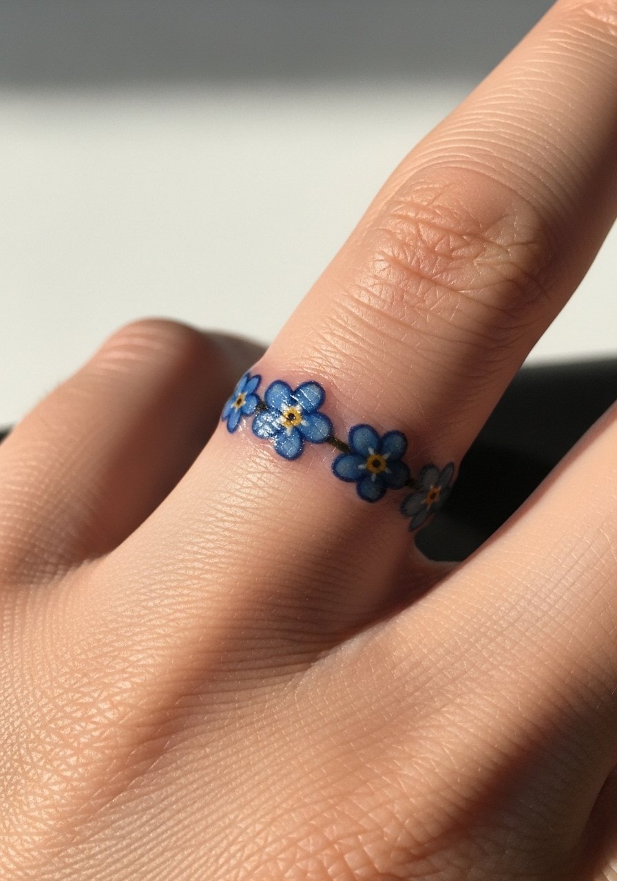 Finger tattoos are popular but notorious for fading and blurring. Forget-me-nots in a minimalist band are meaningful, but expect touch-ups. Pain is high due to thin skin and bone. If you want a lasting finger piece, choose bolder lines and simpler shapes. Keep hands out of harsh detergents while healing—fingers are high-use zones and need extra care.