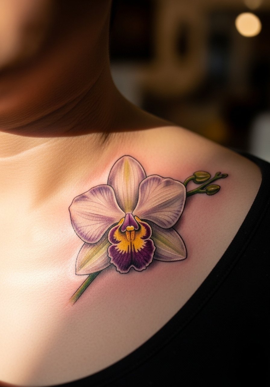 Orchids translate beautifully in micro-realism for a refined look. Collarbone placement gives visibility and elegance. Pain is moderate and healing requires avoiding necklaces and straps. Micro shading holds better when artists use tiny amounts of contrast. I recommend seeing healed examples on similar skin tones—orchid whites and pale colors can read differently once healed.