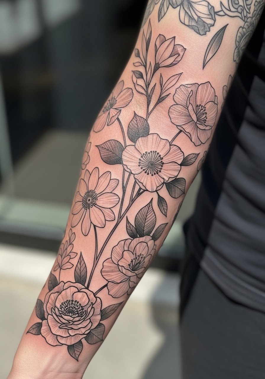 I’ve seen sleeves that thread multiple birth flowers together as a family map. This lets you build narrative across styles—fine line for personal verses, neo-traditional for bold anchors. Expect multiple sessions and evolving pain depending on location. Healing is staged; each session needs full aftercare. Plan negative space so elements don’t merge. This approach is great if you want an intentional, timeless piece.