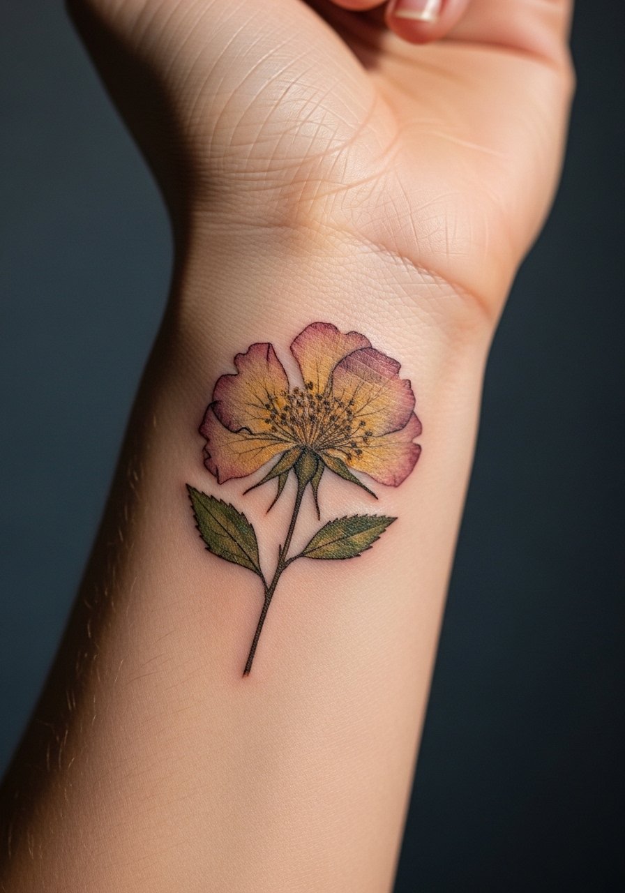 Pressed flower tattoos mimic dried botanicals—perfect for sentimental pieces. The inside wrist is visible and intimate. This style leans on muted color and soft edges to sell the pressed effect. Expect low pain but keep the area protected from friction. Over-saturation ruins the vintage look; ask your artist for thin layering to achieve authenticity.