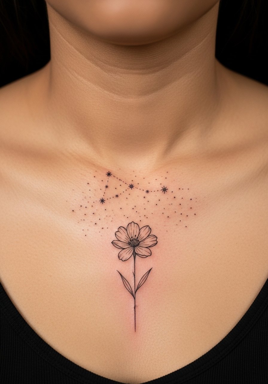 Pairing your birth flower with a constellation adds a personal sky map. Sternum placement amplifies intimacy but increases pain. Fine line florals anchored with dotwork stars age well when the lines are bold enough to survive settling. Keep in mind chest movement affects healing. This combo reads like a small personal emblem—discuss scale carefully.