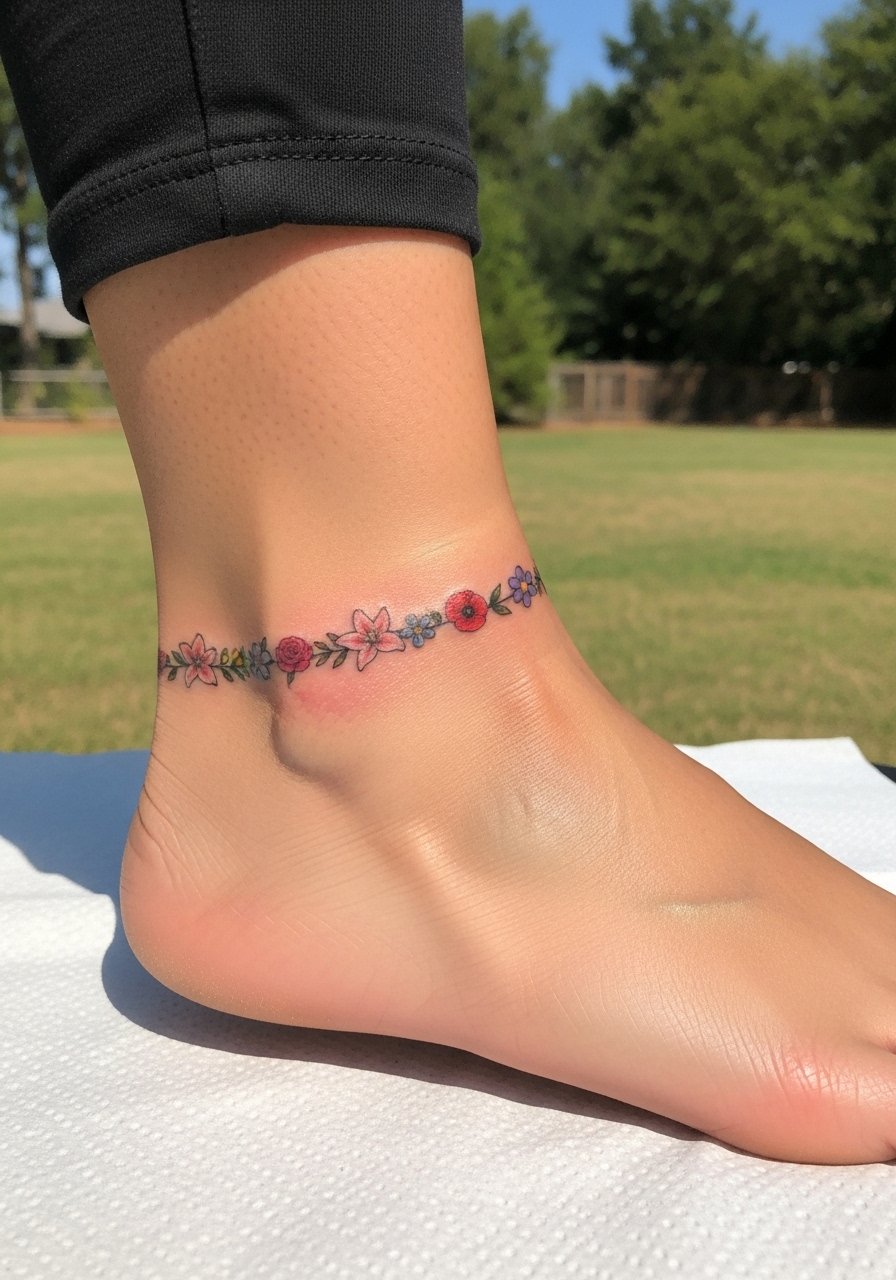 Anklet bands of small flowers act like permanent jewelry. Ankles can be fussy with shoes rubbing—plan footwear while healing. Multiple small motifs require consistent line weight so they age congruently. I’ve seen these look charming healed when spacing is generous. Avoid extremely thin stems that can vanish.