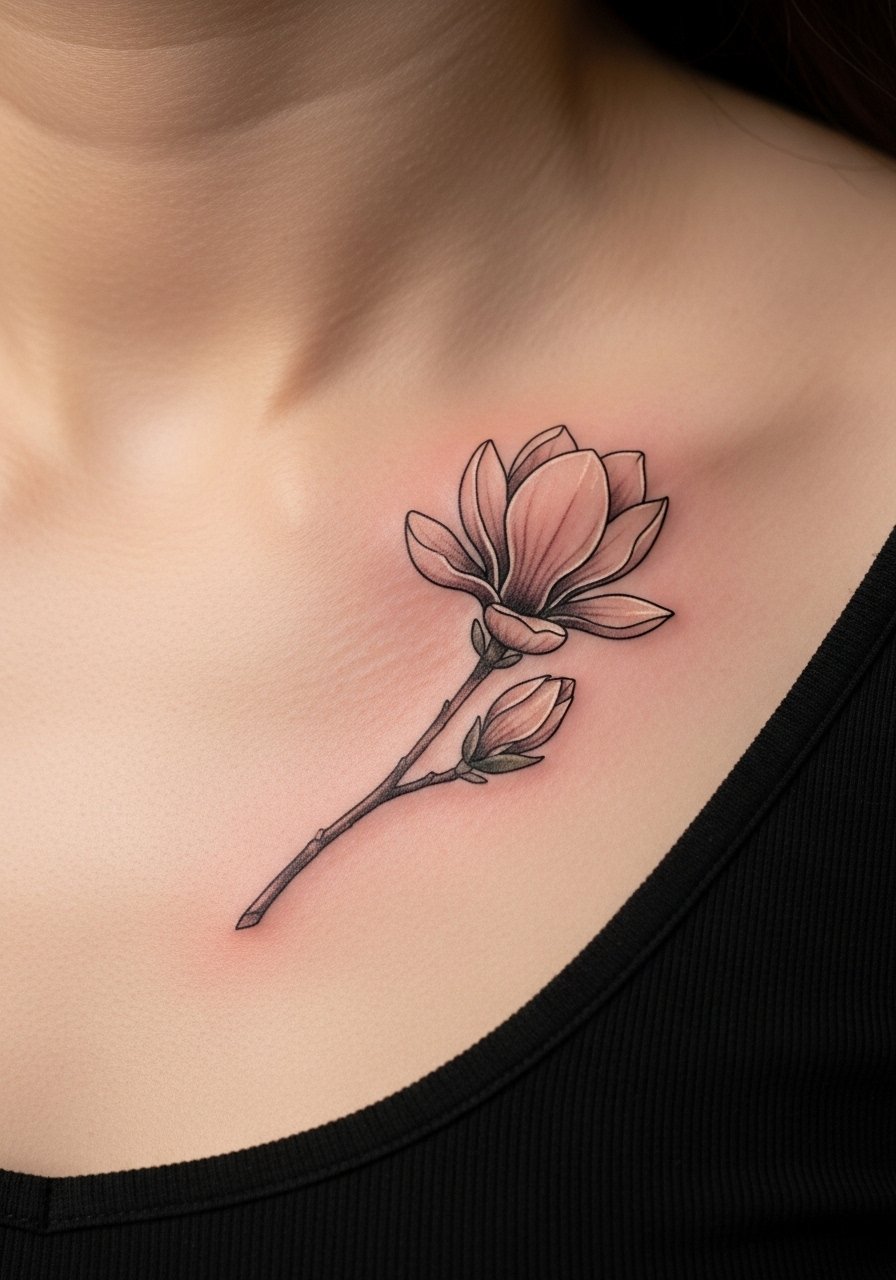 Magnolias are bold yet refined in single-stem placements. Sternum edges are sensitive; expect strong pain. Works well for a vertical, intimate accent. Heals with careful clothing choices. Lines should be confident to account for chest movement; avoid wispy outlines that disappear.