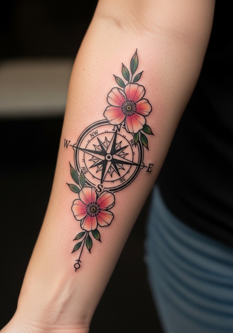 Combining a compass with your birth flower turns a botanical into a life-direction symbol. Outer forearm placement is low-pain and durable. Make sure the compass lines are bold enough to last. Heals predictably; this is a good spot for visible symbolism that’s not overly flashy.