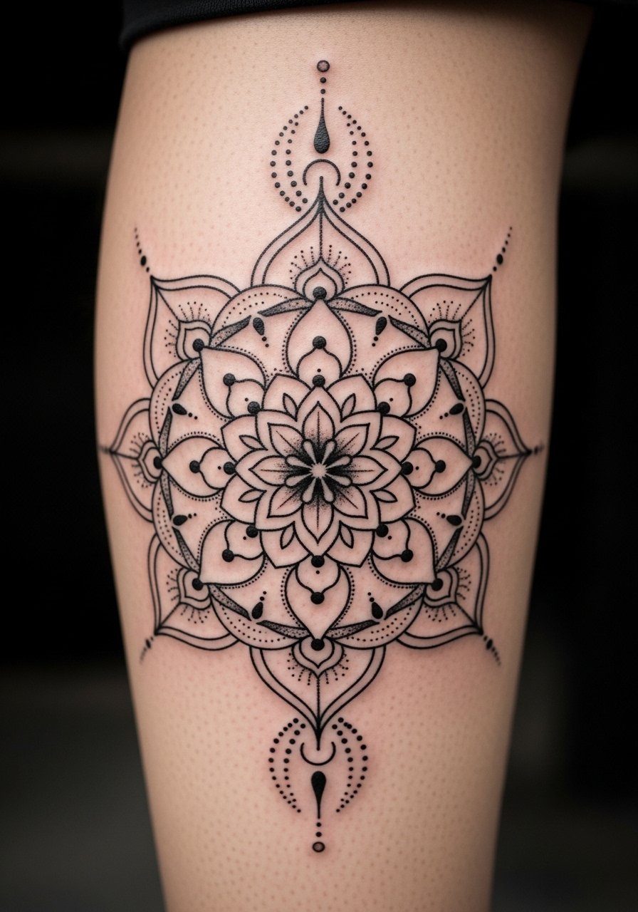 Merging geometry with your birth flower creates a meditative, balanced design. Calves offer a firm surface for symmetry and heal well. Dotwork needs consistent density to avoid patchy healing. Pain is moderate. Artists should plan spacing to maintain mandala clarity as skin ages.
