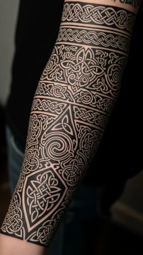 A full forearm knot sleeve creates impact through repetition and flow. The eye naturally follows the pattern, which keeps even dense designs readable. This style works best when the knots wrap smoothly around the arm instead of stopping at sharp edges.