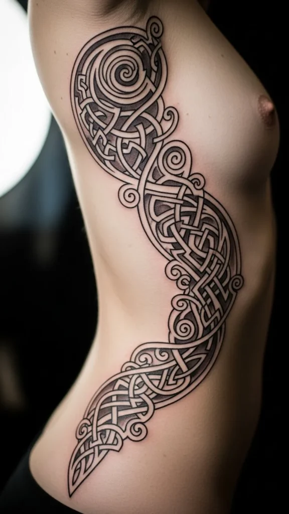 Ribcage knots follow the body’s curve naturally. Long, flowing patterns suit this area.