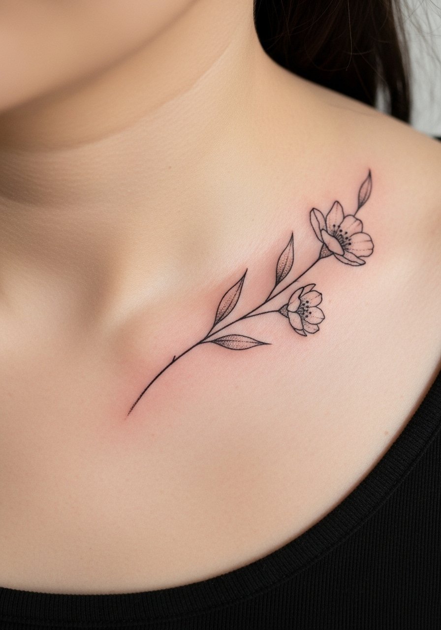 When you want something feminine but unobtrusive, a branch along the collarbone is a smart choice. Session time is brief for a small piece, and pain is usually on the low side unless the needle hugs the bone. Tell your artist you want negative space between petals and thin stem linework with light stipple shading. A frequent mistake is overfilling petals with solid colour, which flattens and fades oddly over time. On clavicle placement the linework sees sun and movement, so expect mild softening at 6 months and note that a small touch-up at year two can restore crispness.